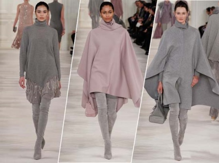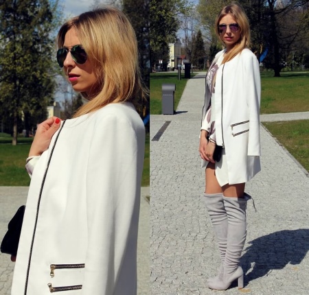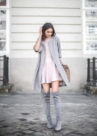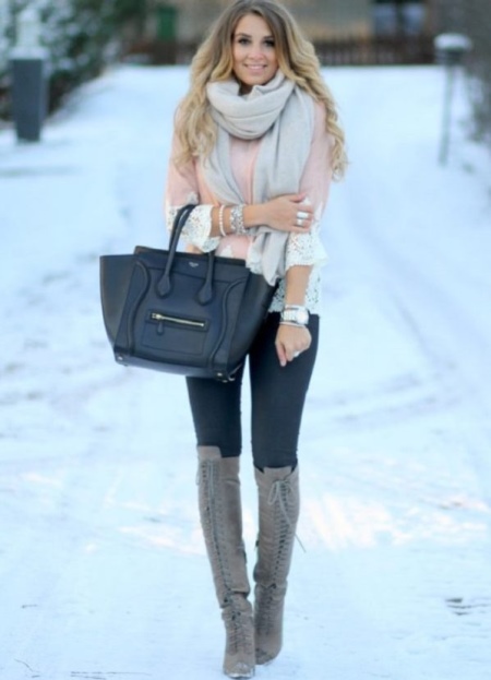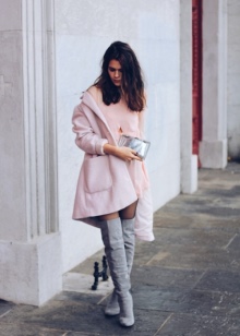 - The combination of gray boots with heels and a coat of beige, cream or coffee color looks feminine and attractive;
