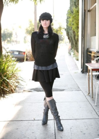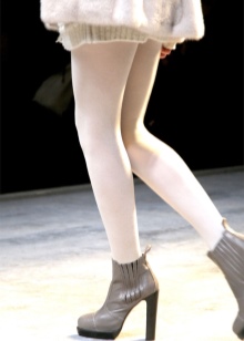 Many ladies believe that tight tights and gray boots look ridiculous. But in cold weather, this combination is indispensable. Warm tights and neutral shoes should not be worn only for work. For such a case, it is better to choose thin body models.