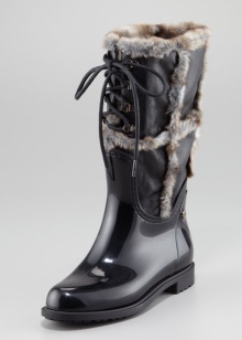 - Lacquered boots with fur trim over the top of the boot look original and fashionable. The model is made in contrast to the texture of the skin. This may be the lower lacquer part with an ankle having a python skin relief. The boots are fastened with metal zippers on the side and decorated with buckle straps.