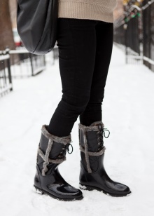 - Black boots with a thick steady heel harmoniously look in the image, composed of black skinny and a dark blue jacket with a fur trim on the collar. Dilute plain clothes can accessories to match the shoes.