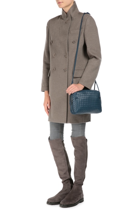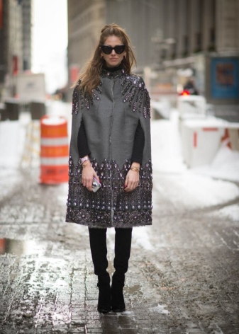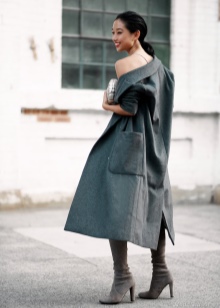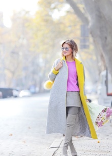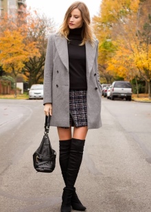 - Tall black boots go well with tight gray trousers, a cream tunic and a light coat above the knee. A black bag and a scarf snood are perfect accessories for this look.