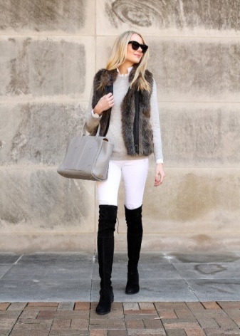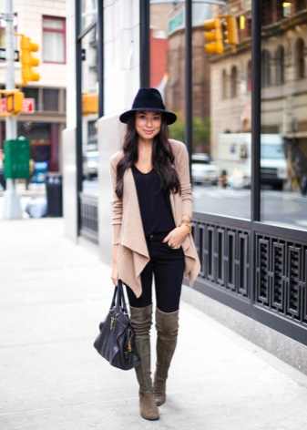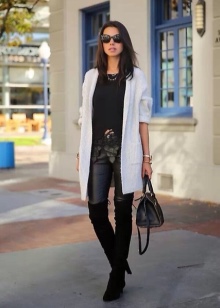 - For everyday looks, you can wear boots with leggings, tight-fitting trousers and jeans. Harmoniously complement an outfit cardigan, cardigan or tunic.