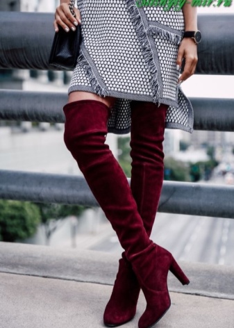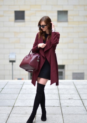 Stylish boots in dark color can be worn with a short dress to match the shoes and a burgundy coat.