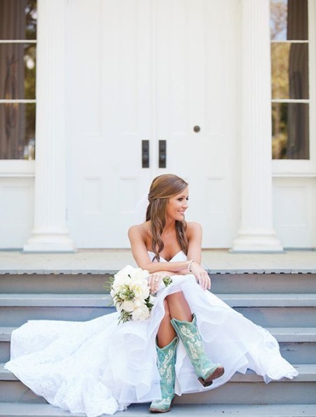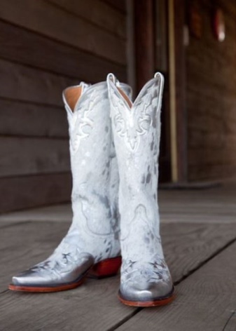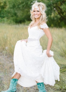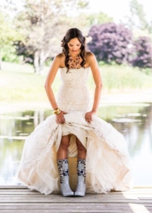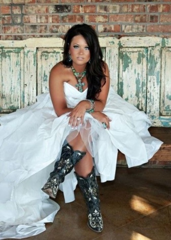 - Cowboy boots. Such a model is unlikely to fit the classic wedding dress, but with a stylized dress it will look very harmonious.A rude shape, a wide heel, a free bootleg, metal decor - these boots will be an excellent addition to a short dress, designed in the same style.