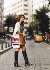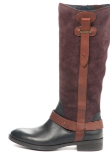 Combined models are in fashion this season. Boots on low speed can be made in combination of genuine leather and suede. The combination of a black bottom with a burgundy shafts looks stylish and catchy. As the finishing touches, fashion designers decorate the product with brown leather straps. They can be located vertically and around the foot.
