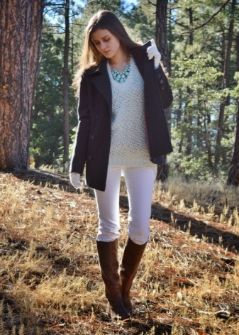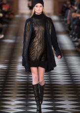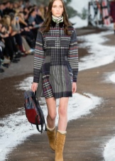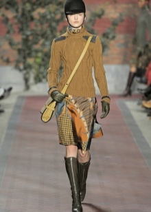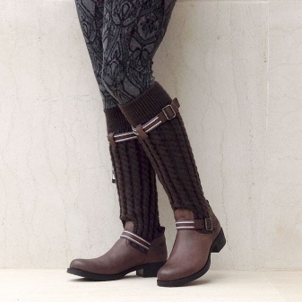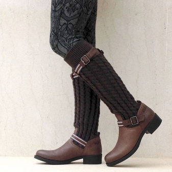 - Knitted high boots look very unusual. The knitting pattern can be different, and the texture of the materials is always performed in the same tone. The sole of such boots has a small wide heel, the height of which allows the legs to be in the most natural position. In the upper part of the bootleg there is a knitted elastic band that provides a tight fit to the legs, protecting it from wind and cold. On top of the elastic band, the boots are decorated with a strap with a metal buckle; on the sides on the top there is a brand logo patch.