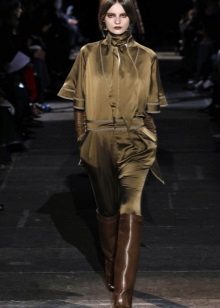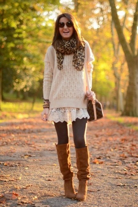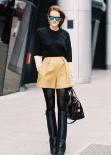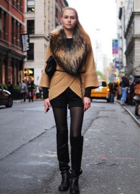 A good option will be shorts, worn on tight opaque tights, and boots, pipes. It is important to remember that it would be nice if the color of tights and boots match. So you will visually appear taller, and your legs will seem just endless.
