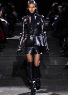 Sometimes designers experiment, and boots can be made of suede with rhinestones or embroidery. Or leather with rivets. Of course, such boots dictate the image.