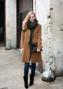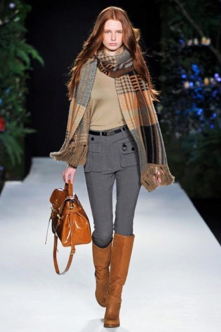 Another everyday option. Tight trousers are tucked into boots that almost match the tone of the bag. The upper part is lush due to a scarf cape. All in gray-brown tones. Stylish.