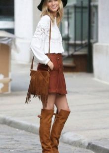 Pay attention to this option. Light brown boots and a half-tone lighter dress make up a nice casual option. A smoky gray fringed bag complements the look. Simple and tasteful.