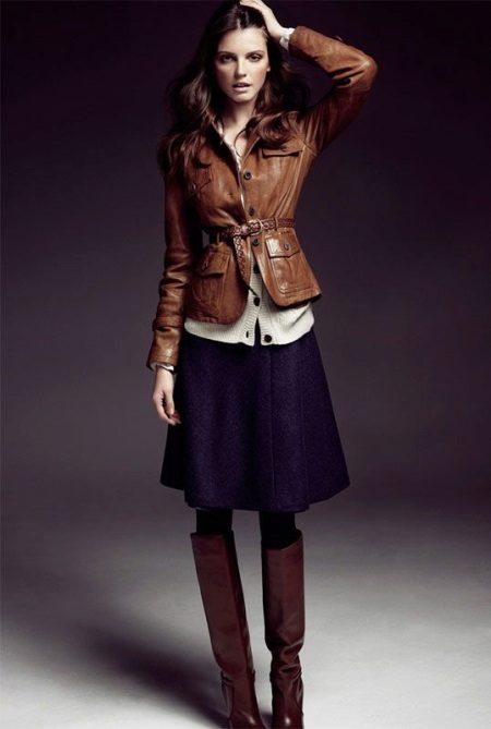 It can be miniskirts, pencil skirts, maxi skirts. Two rules are important here. If this is a maxi skirt, it should be up to the middle of the calf, not lower so that the boots are visible. If this is a pencil skirt, make sure that the edge of the skirt does not coincide with the edge of the boots. It is better if there will be a little overlap so that there is no effect of “cropped” legs.