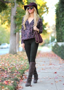 - Over-the-knee boots look great with plain leggings. This combination will look great exclusively on slim ladies. Full girls should better refuse such an ensemble, otherwise it will highlight many of the shortcomings of the figure.