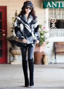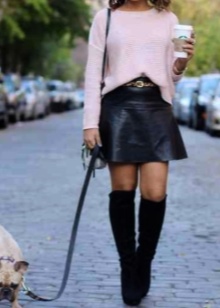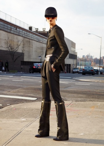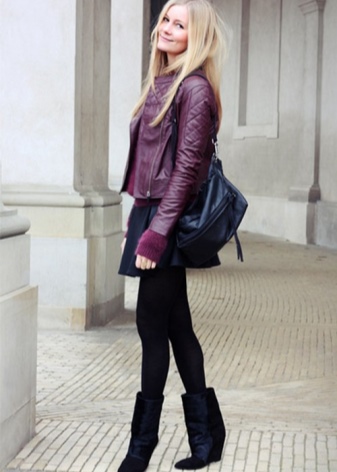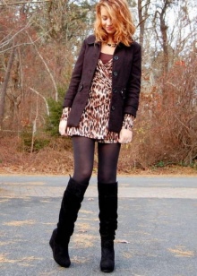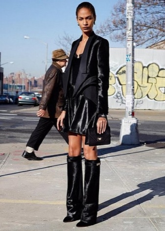 If you wear high over-the-knee boots, then you should remember that such a combination absolutely does not go to full ladies. A bold outfit will be a great solution only for a slim and tall girl. Leggings can be both textile and leather.