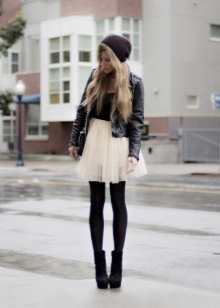 - over-the-knee tights with short skirts and dresses. Long models or midi skirts should not be worn, as they will simply cover up sexy shoes;
