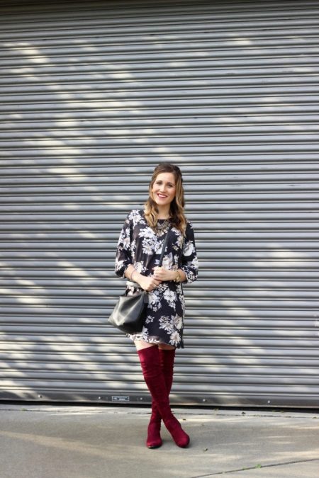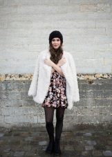 A light cotton dress with a small floral print, complemented by a brown large-knit sweater and dense tights of the same shade, will perfectly combine with stylish red-brown knee-high boots. A massive cream-colored collar complements the image.