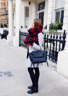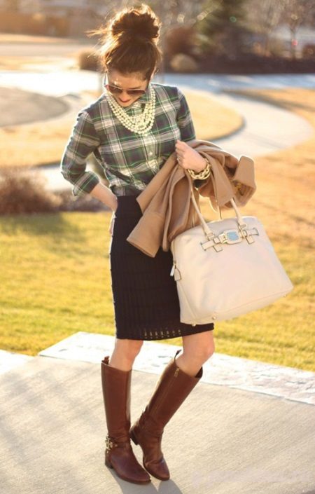 A straight black knee-length skirt and a plaid shirt are a classic of the genre. A cropped cashmere coat, a cream-colored stylish tote bag, and stunning brown boots with golden metal decorative elements are what you need to complement the look.