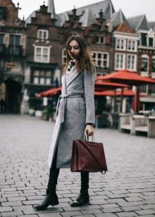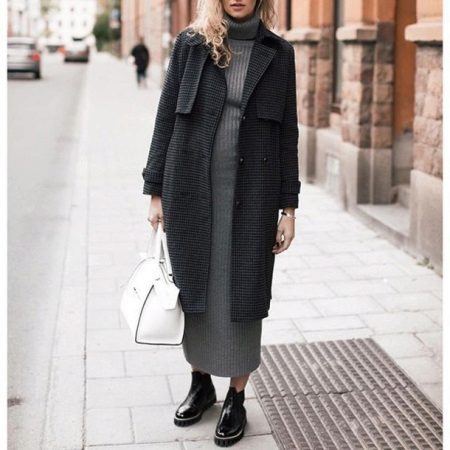 The stunning shortened coat of brick color has a “bat” cut and is most successfully combined with narrow blue trousers made of thick fabric and stylish boots of light brown color with a free bootleg. The image is complemented by a stylish tote bag matching the boots.