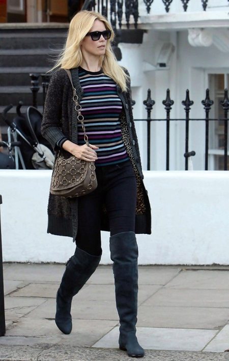 Suede over the knee boots the color of wet asphalt, no doubt, will be a worthy addition to any image. And in combination with skinny dark blue jeans, a striped blouse and a dark gray knit cardigan, the outfit will turn out to be very interesting.