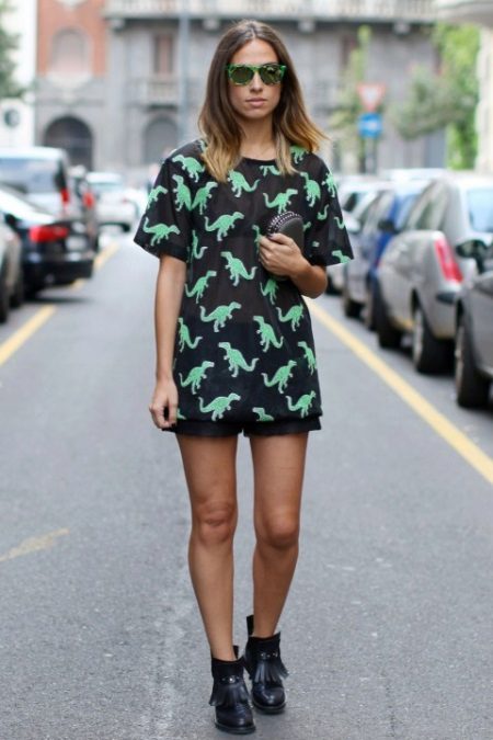 A casual look, suitable for the bustle of the city, consists of a free black and white leopard print sweater, classic leather shorts and a stylish accessory in the form of a small black handbag on a chain. Stunning black boots without a heel, which are emphasized by long slim legs, complement the image.