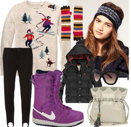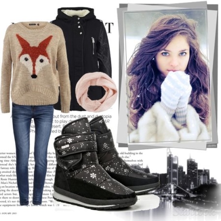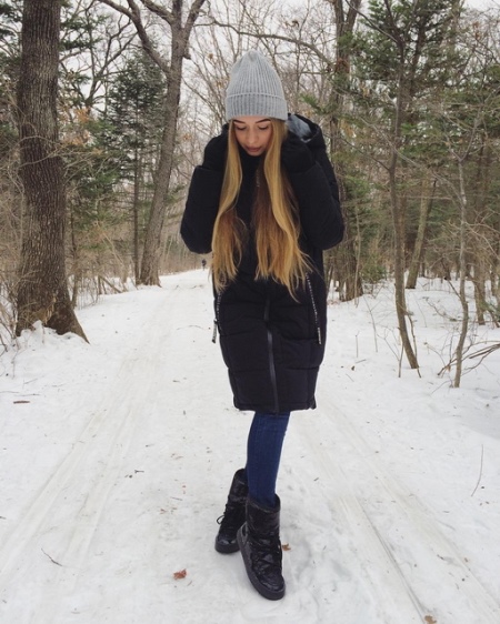 First of all, with puffy jackets or down jackets, designed in casual style. Especially if they are created in the same color scheme as the shoes. A knitted hat and a scarf will complement the image.