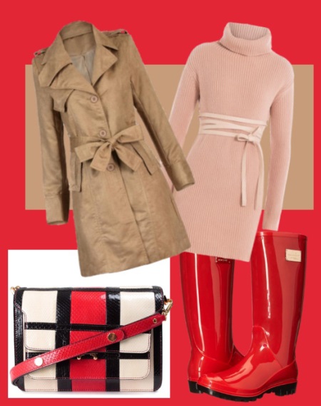 - With a cloak and dress. In the photo you see a trench coat, a knitted mini-dress and bright red boots. A great combination of pale pink, red and natural colors.
