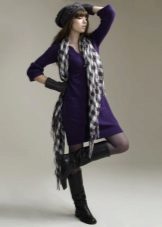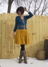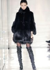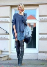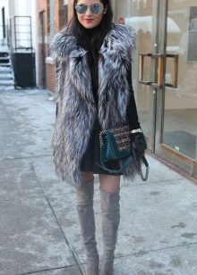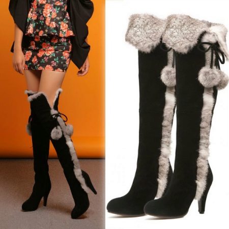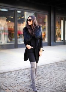 Narrow, long boots, richly trimmed with fur, harmoniously complement any outfit. For example, a bright mini-dress with a black cardigan.