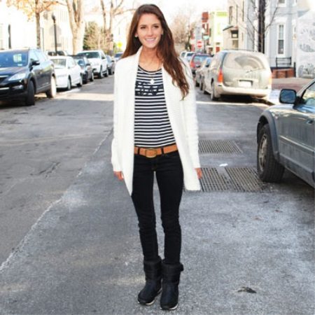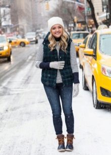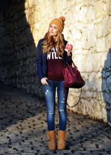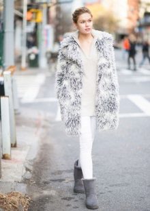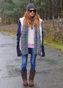 Graceful fur boots are perfect for a set of skinny jeans, t-shirts, shirts and parka jackets. A funny hat with a pompom harmoniously completes the stylish casual image of a young girl.