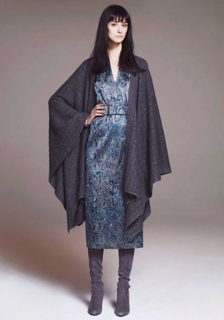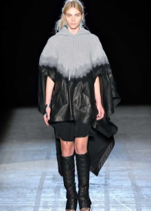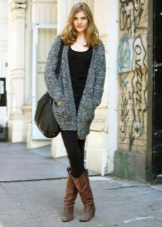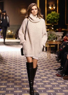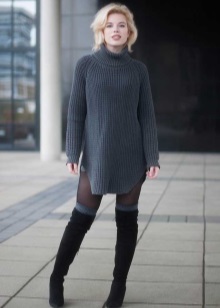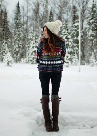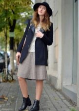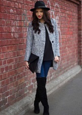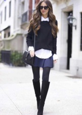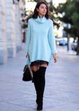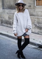 Black high-heeled boots with a loose top look great with a black miniskirt and a blue oversized cashmere sweater. So that the image does not look slightly rustic, you can supplement it with a felt hat with wide brim and massive jewelry on the neck.