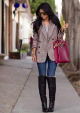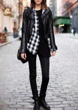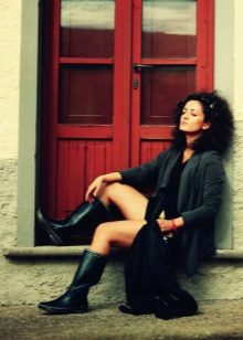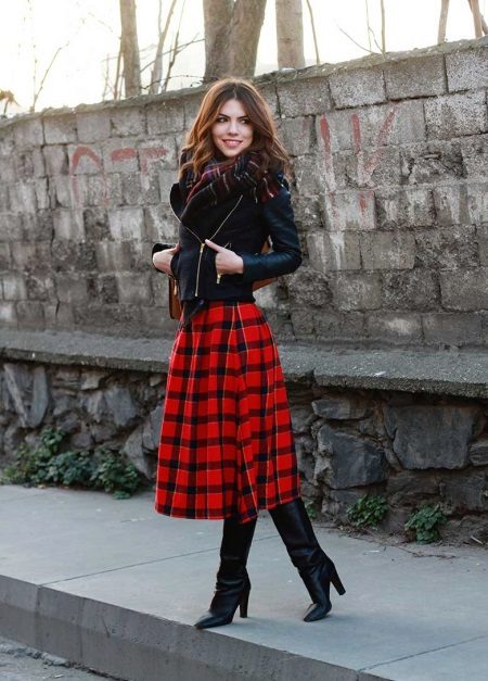 Black leather boots with a stable thickened heel and a slightly pointed toe will help to create a very feminine and bright look, if you combine them with a bright midi skirt in a black and red check, shortened leather jacket and a checkered scarf in red, blue and green colors.