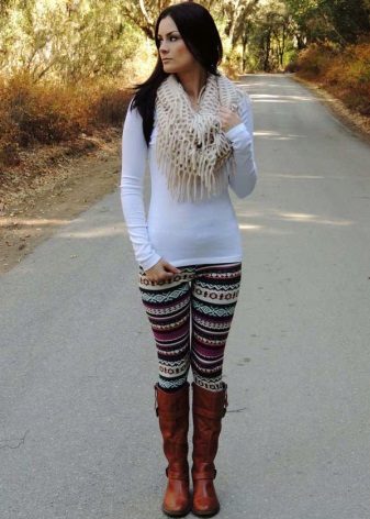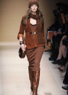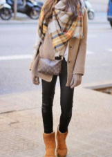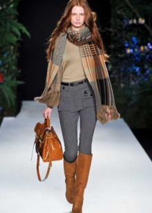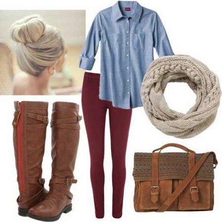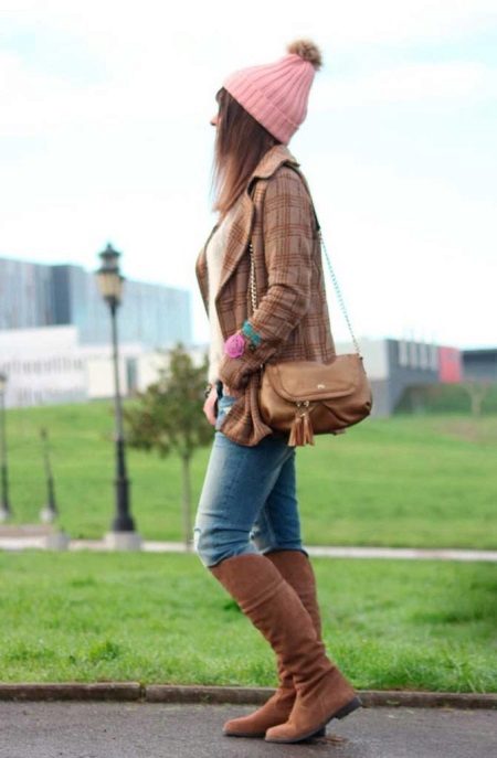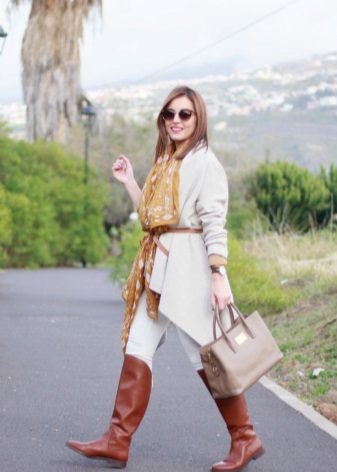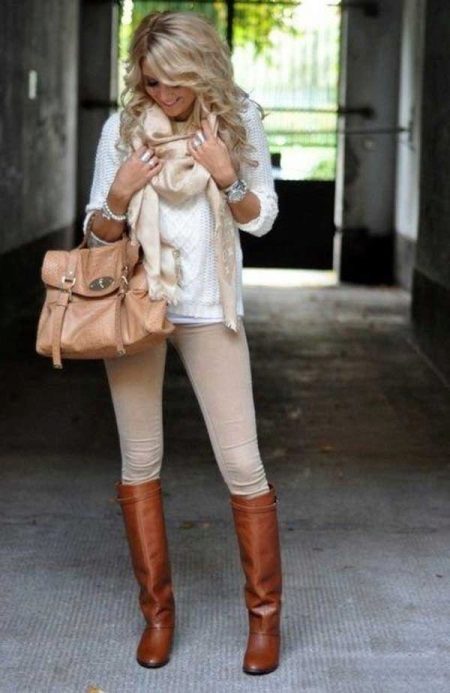 Brown boots on a low thick heel will become a bright detail of a delicate image.In combination with such shoes, narrow beige jeans look perfect, a large knit white sweater with rhombus and braid patterns, as well as a cream-colored stole tied around the neck, and a large beige bag.
