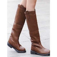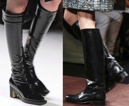- Jockeys. Knee-high boots with a low square heel. They have a fastener at the back in the form of a neat zipper and a rounded toe shape.