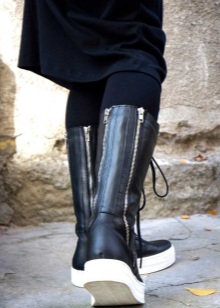 Incredibly stylish boots with a wide top and toe, made of genuine black leather, will be very interesting to combine with a leather pleated mini skirt, a gray blouse and an oversized cashmere coat. A small burgundy handbag will help to complement and slightly dilute the dark shades of the image.