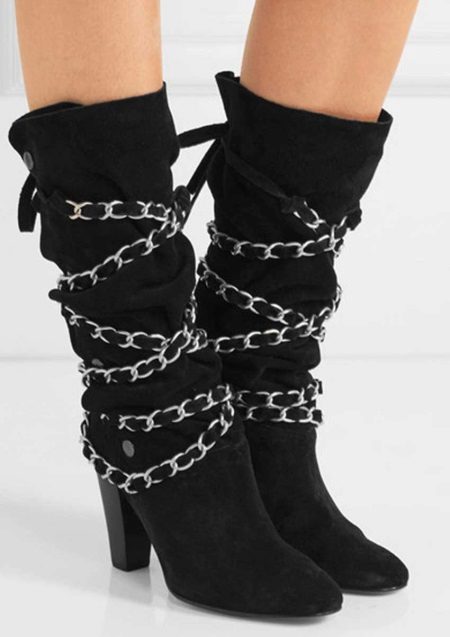 Very often black, gray and dark brown boots are decorated with a massive chain. Such decor, although it gives the shoes a slightly more informal look, but, nevertheless, does not prevent such boots from harmoniously blending with classic things.