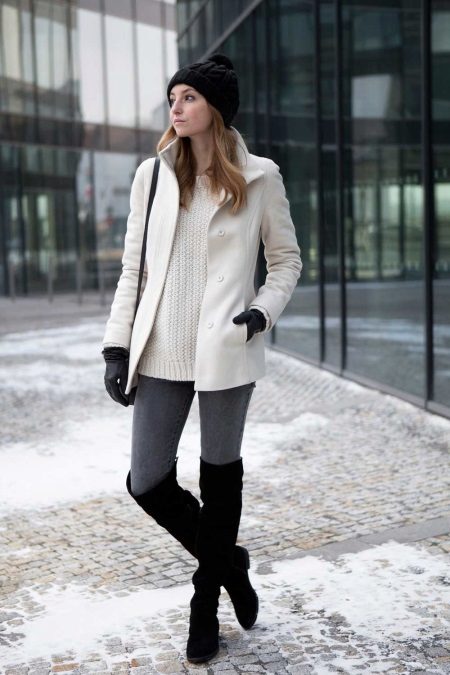 Black suede flat over the knee boots will fit perfectly with skinny gray jeans, an elongated white knit sweater, and a crochet cashmere coat that matches your sweater. As a stylish and harmonious addition, a black hat and gloves are suitable.