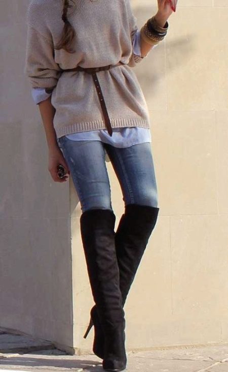 Suede black knee-high boots with thin heels combine perfectly with skinny jeans in a classic blue hue. Complement this combination with a stylish oversized shirt, a light sweater worn over it and a small strap at the waist, and get a trendy casual look.