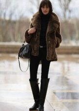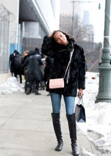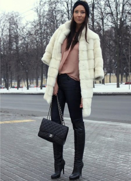 A short-sleeved fur coat creates a monochrome classic bow with tall leather boots with thin heels. Under the fur coat there is a light peach blouse, dark blue tight jeans. There is a black bag on chains and a black turban hat.