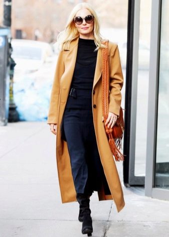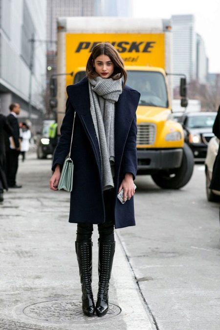 In warm winters, you can afford to wear a coat. The blue oversize model with large lapels is combined with a long warm gray scarf, tight-fitting trousers and high black patent leather boots. Shoes have a sharp toe and a zipper, as a fastener, and in front they are decorated with metal details that imitate the lacing. The image is completed by a neat handbag on the shoulder.