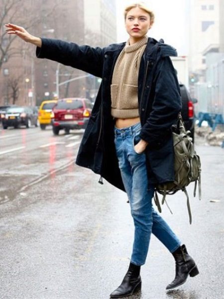 Another option with a parka, this time blue, but with ankle boots in a short square heel. The height of the shoe allows you to wear blue cropped jeans. Beige cropped sweater on top. A khaki backpack was used as a bag.