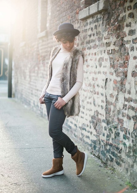 The model is presented in 4 color variations: dark and light brown, black and gray. The interior is faux fur, which protrudes outward along the edging of the boots. The boots are not equipped with a zipper, but they have a lacing, with which you can adjust the width of the shaft.