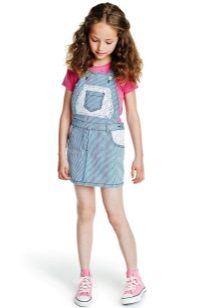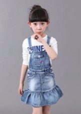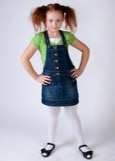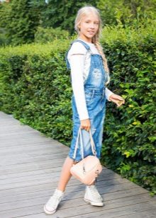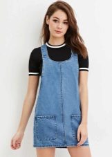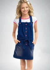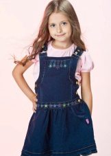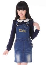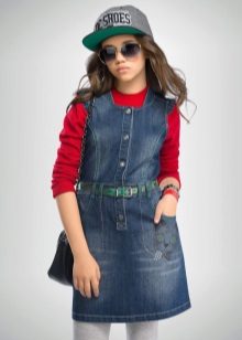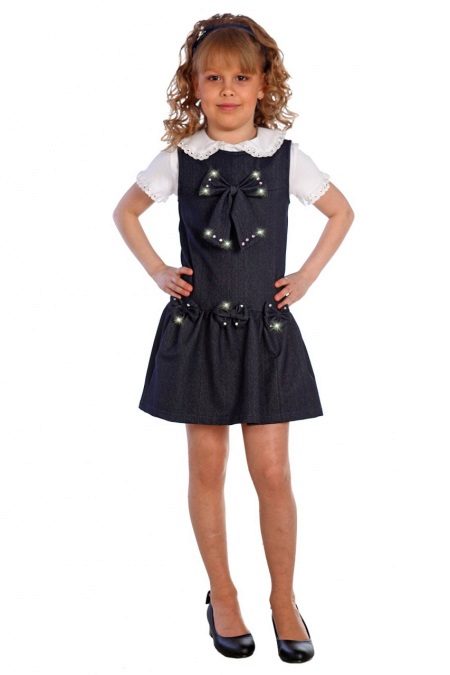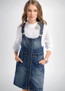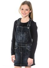 - School sundress. If the dress code of the institution allows a free style of clothing, then a jeans sundress will become simply an indispensable element of the school wardrobe. A black, dark gray, blue or blue sundress of a straight, fitted, trapezoidal silhouette or flared is ideal for school blouses, shirts and turtlenecks. The girl looks very neat and elegant.
