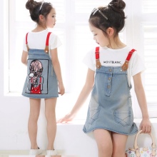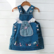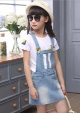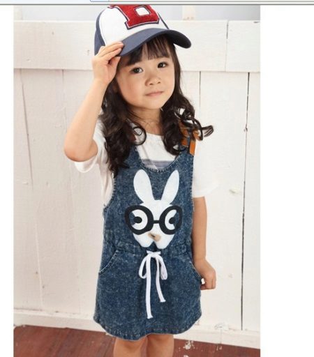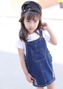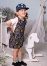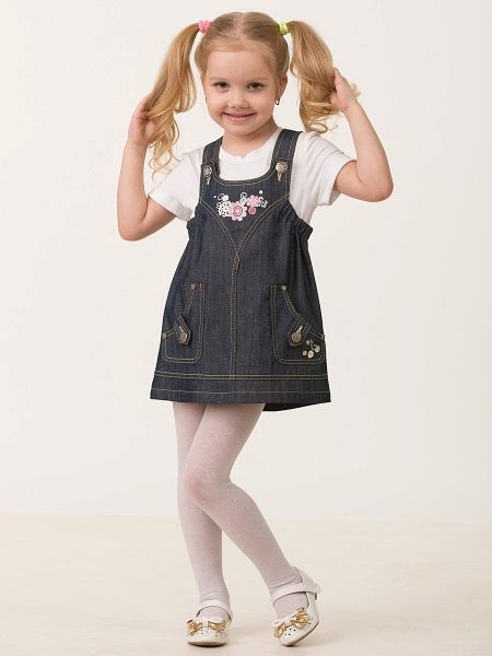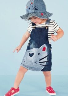 For a little princess there is nothing better than a denim sundress of a direct silhouette on an elastic band. Such a model looks very stylish, and putting it on your own will not be difficult. And what kind of child does not like applications in the form of funny animals? A white T-shirt, a denim cap and a young beauty are ready to go!