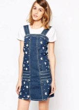 Despite the fact that jeans themselves are quite interesting fabric, designers annually compete in its decoration. Denim sundresses are often decorated with embroidery - it can be on the back or on the chest, go along the sleeve or hem, create an asymmetric pattern.