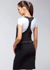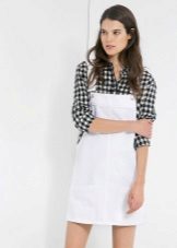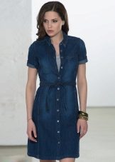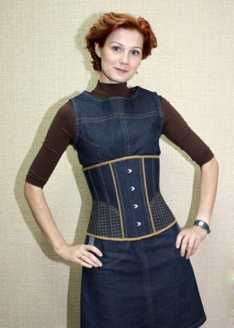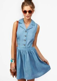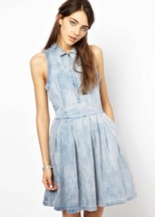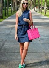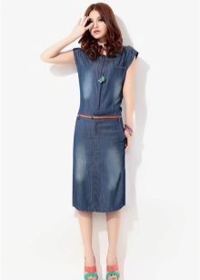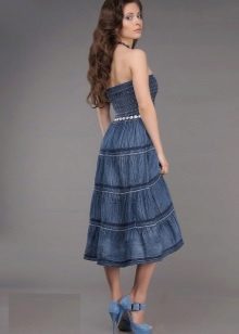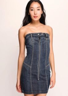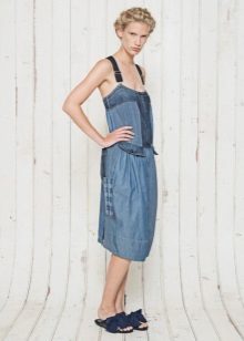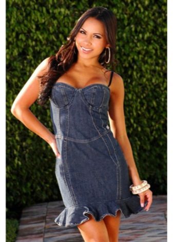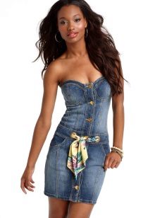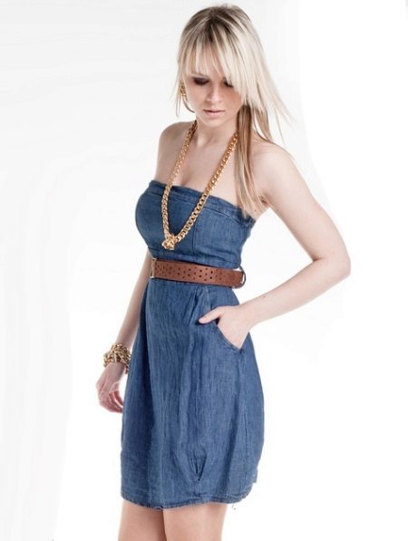 A sundress-case made of jeans without sleeves and straps beautifully emphasizes the bust, and the O-shaped silhouette of the skirt makes the hips seductively round. This simple and convenient option goes well with a leather belt and massive jewelry.