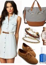 Sundresses in a romantic style, with a flying or magnificent skirt, will be good with jewelry made of leather, wood or bright stones, in the style of "ethno" or "boho". Classic jewelry will not fit under denim, do not forget about it. But the bag can be anything from a voluminous “shopper” to a varnish miniature clutch.