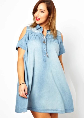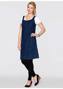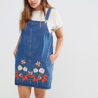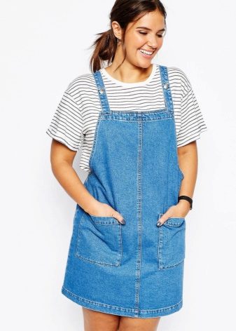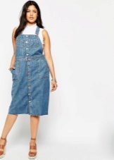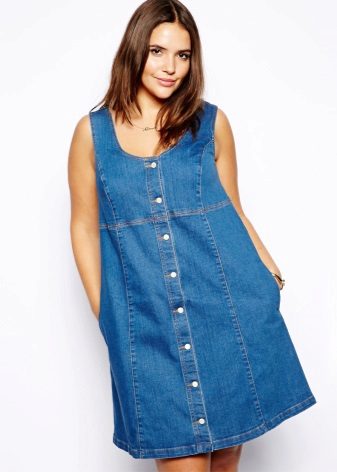 Separately, it is worth mentioning the models of denim sundresses of large sizes. Denim is ideal for those who want to hide the imperfections of the figure: it is dense and well holds all the problem areas in the right framework, while the patterns of jeans sarafans are so diverse and allow many combinations.