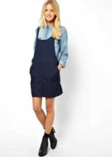To create an original image, you can combine a denim sundress with an informal jacket, shoes, loafers or boots with tractor-soled shoes.