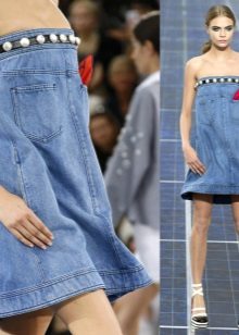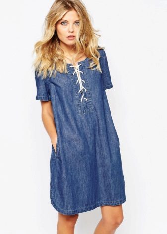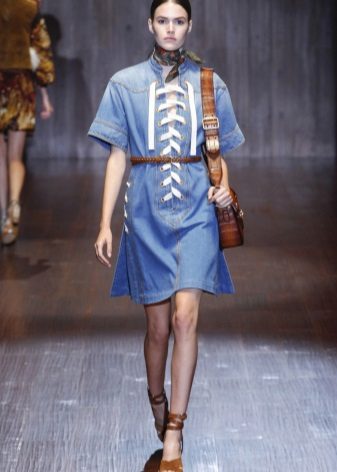Another version of the jeans sundress decor is leather lacing. Designers use it to create eye-catching cutouts, both on the skirt and in the neckline. Such models can be supplemented with belts or leather overlays on pockets or a collar.