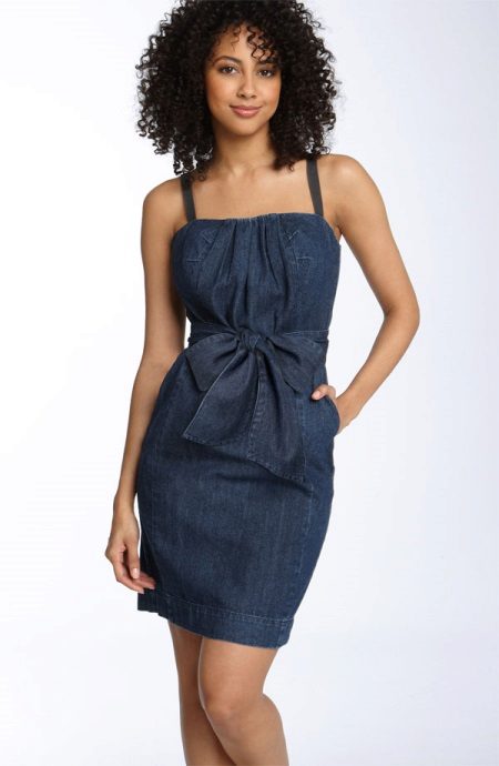 The original dark denim dress with a bow-like decor creates a romantic but modest look. The outfit has a “tulip” cut, comfortable straps and a beautiful cut. This stylish option is good for naked body, it is so self-sufficient that it does not even require accessories.
