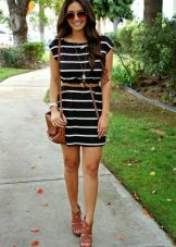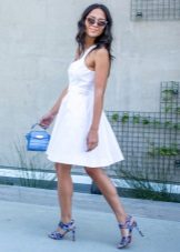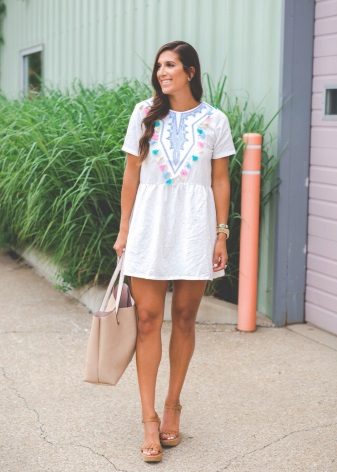 A blue short dress with a v-neck and an elastic band at the waist can be combined with a brown handbag over your shoulder and platform sandals in tone. Accessories should choose multi-colored, for example, a white bracelet and blue-yellow earrings.