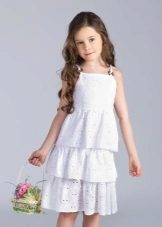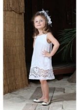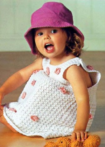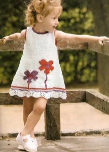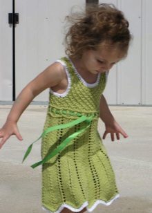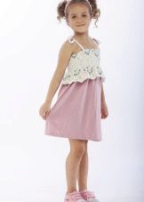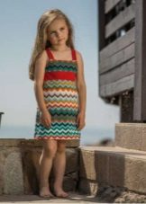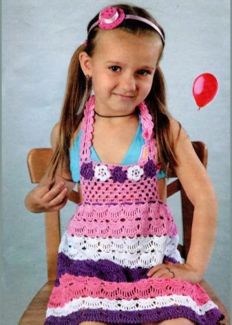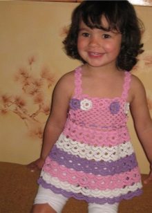 Knitted things are returning to fashion, and among children's sundresses a similar trend is also observed. The product is very similar to a tunic. The straps can be narrow and wide, fastened in parallel lines or crosswise. Often, knitted sundresses are decorated with frills, due to which the sundress looks air-elegant. Sundresses are usually decorated with lace, beads, sequins, laces, ribbons. In addition to the main product, a bolero, figaro or cape is offered. In combination with this item, the sundress looks like a dress that can be worn on a cool summer evening.